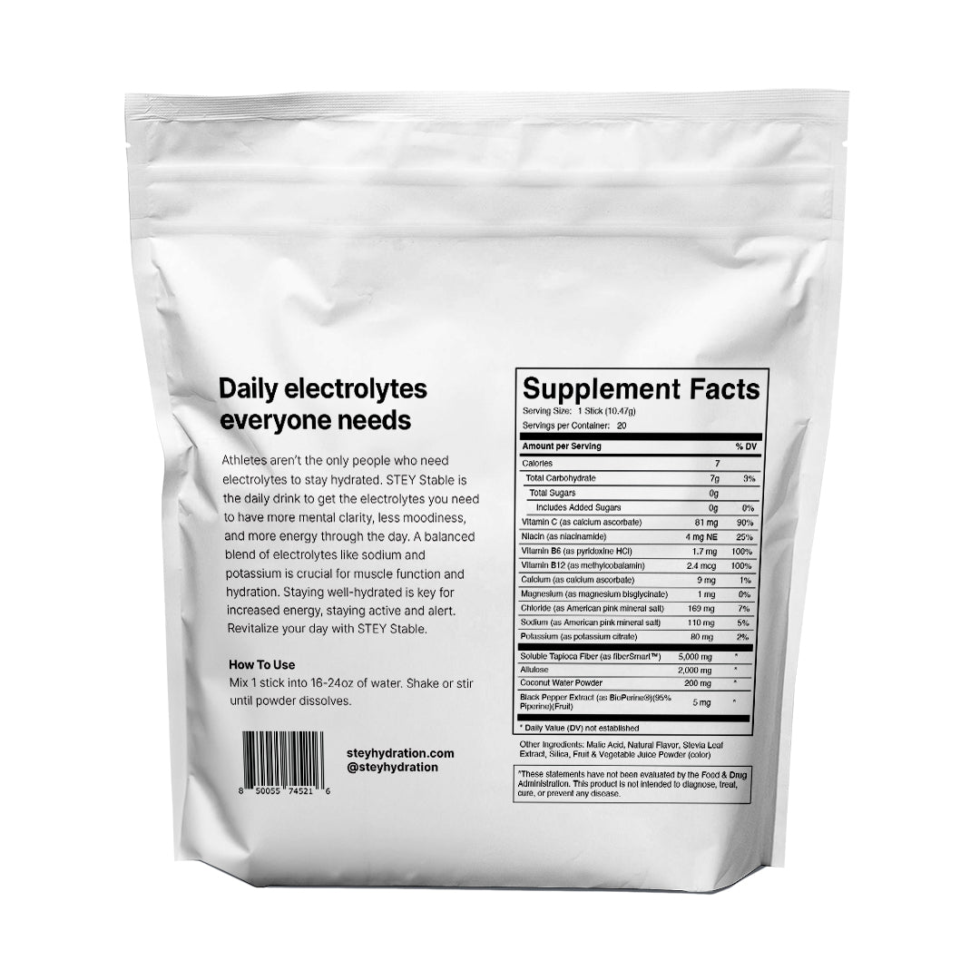STEY Stable is designed to support your everyday health with a powerhouse of hydration and vitamins. This calorie-free beverage is the perfect addition to your daily routine, providing essential electrolytes, B vitamins, and Vitamin C, all with natural flavors and no added sugar.